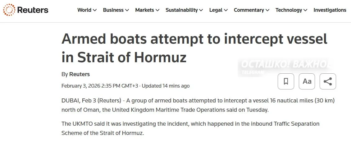 3 февраля 2026 года группа вооружённых катеров попыталась перехватить нефтяной танкер под флагом США в Ормузском проливе, в 30 км к северу от Омана, — сообщает британская служба безопасности судоходства в этом стратегическом районе.