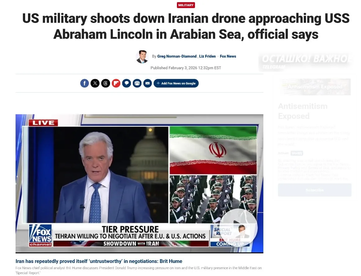 Также американские СМИ сообщают, что США сбили иранский дрон Shahed-139 у авианосца USS Abraham Lincoln.