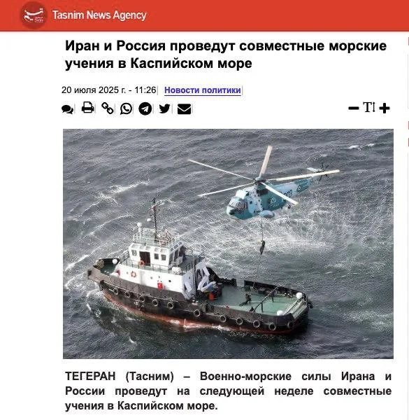 Россия и Иран с 21 июля начинают совместные военно-морские учения CASAREX-2025 в акватории Каспийского моря. Манёвры продлятся три дня и пройдут при участии ВМС двух стран, а также элитных подразделений Корпуса стражей исламской революции (КСИР). Целью учений заявлено повышение уровня морской безопасности и координации действий прикаспийских государств.