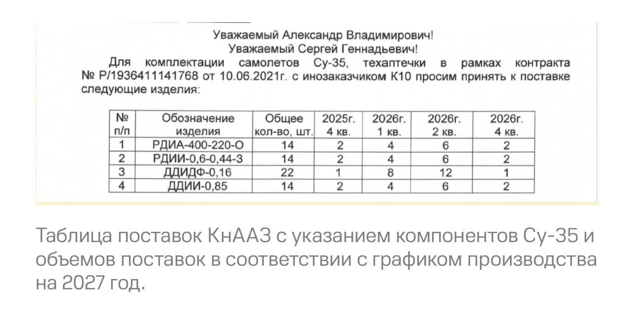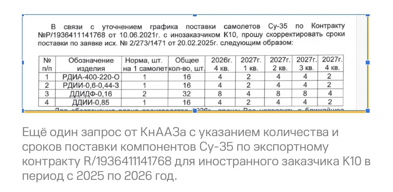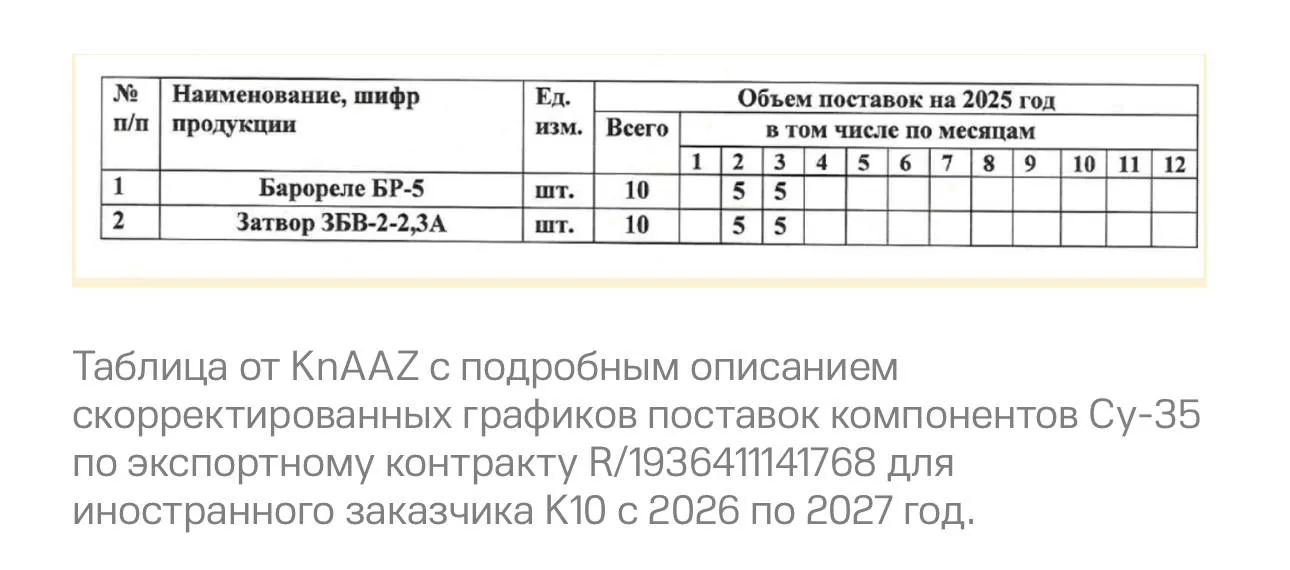 Как следует из документов, заказ должен быть выполнен в период с 2025 по 2027 год. Некоторые самолёты уже должны были получить запчасти в начале этого года и могут быть готовы к поставке, как указано в более старых документах.