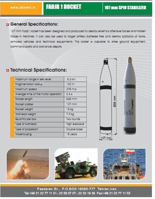 Стоит вспомнить про иранскую 107-мм РСЗО Фаджр-1, являющуюся совместимой родственницей компактной северокорейской Тип-75). Ракеты имеют сравнимые ТТХ (описание на фото).
