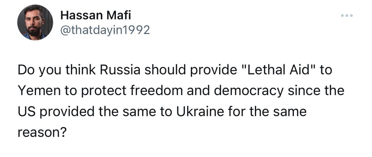 «Как вы считаете, Россия должна предоставить «смертельную помощь» Йемену для защиты свободы и демократии, поскольку США предоставили то же самое Украине по той же причине?», — написал Мафи.