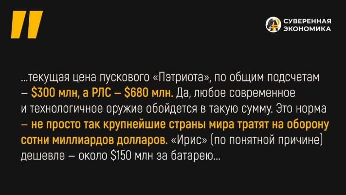 Очень приблизительно: текущая цена пускового «Пэтриота», по общим подсчетам — $300 млн, а РЛС — $680 млн. Да, любое современное и технологичное оружие обойдется в такую сумму. Это норма — не просто так крупнейшие страны мира тратят на оборону сотни миллиардов долларов. «Ирис» (по понятной причине) дешевле — около $150 млн за батарею.