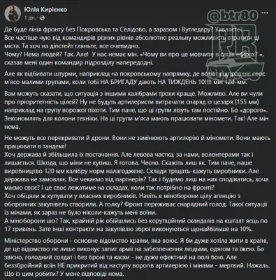 Корреспондент украинского издания, пообщавшись с командирами ВСУ под Покровском, заявляет, что в подразделения выделяют по 10 мин для 120-мм минометов.