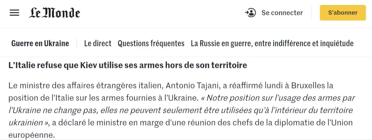 Министр иностранных дел Антонио Таяни заявил, что позиция Италии в отношении применения Украиной оружия не меняется, оно может быть использовано только на территории Украины.
