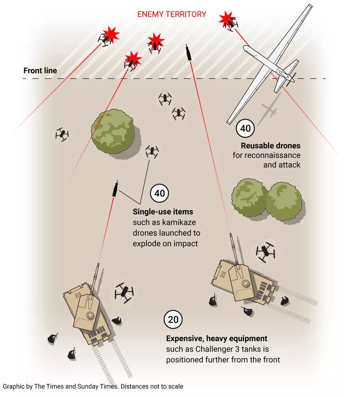 20% тяжёлых платформ, таких как танки Challenger 2 или новые Challenger 3, будут размещены на безопасном расстоянии после того, как 40% дронов-камикадзе (и/или танковых/управляемых боеприпасов) будут запущены по противнику. В то же время остальные 40% будут направлены на развёртывание систем многократного использования для повышения осведомлённости о ситуации на поле боя и нанесения точных ударов – разведывательных БПЛА и БПЛА MALE-класса (в частности, закупаемых MQ-9 Reaper).