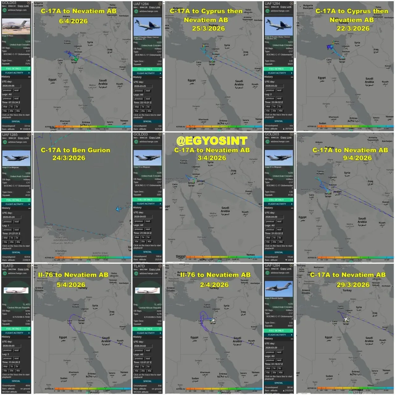 Факт переброски также косвенно подтверждается сразу несколькими рейсами эмиратских военно-транспортных самолетов C-17A Globemaster III и Ил-76, выполненных в конце февраля-начале марта на израильскую авиабазу Неватим.
