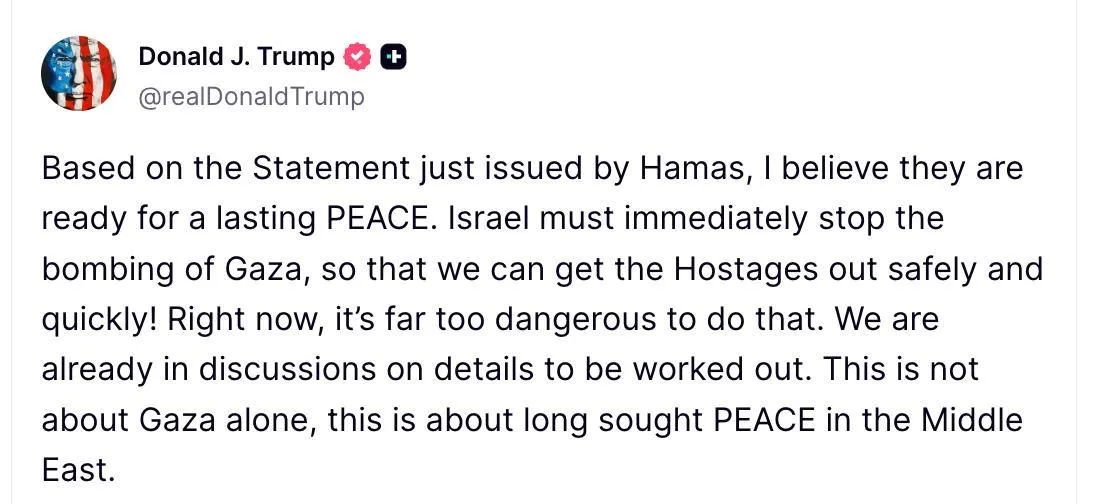 Уже утром Трамп положительно отреагировал на слова ХАМАСа о пути к миру и призвал Израиль прекратить бомбардировки. Но ультиматум остаётся в силе: до 5 октября у движения есть время подписать договорнячок, иначе, по словам Трампа, «на них обрушится такой ад, которого никто никогда раньше не видел».