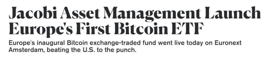 Европа превзошла США, запустив первый биржевой биткоин ETF, поскольку сегодня лондонская компания Jacobi Asset Management объявила о листинге продукта на Euronext Amsterdam.