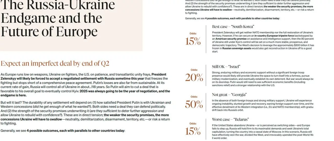 Примечательно, что во всех сценариях JPMorgan не рассматривает возможность возврата Украиной утраченных территорий. Страна представлена как объект, который либо будет разделён, либо законсервирован в состоянии перманентного конфликта.