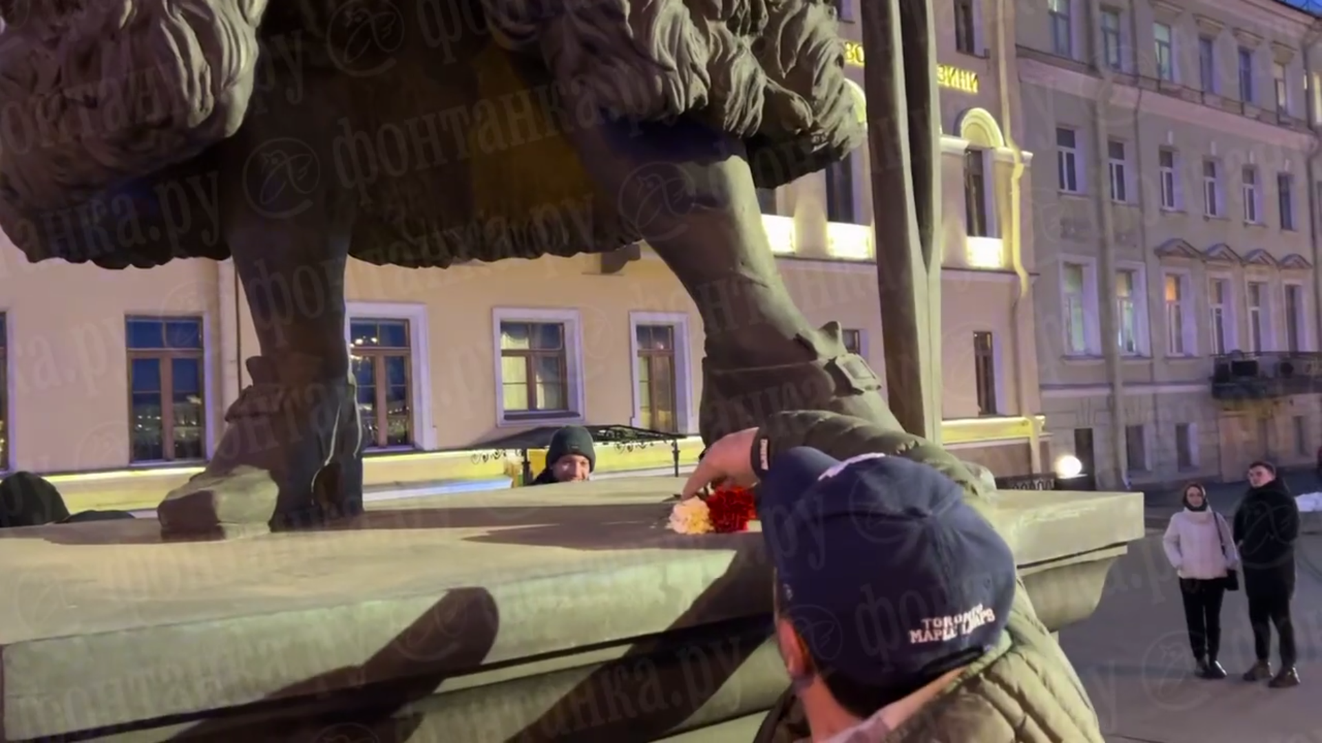 Место трагедии оцеплено, люди приносят цветы к памятнику Трезини неподалёку от кафе.