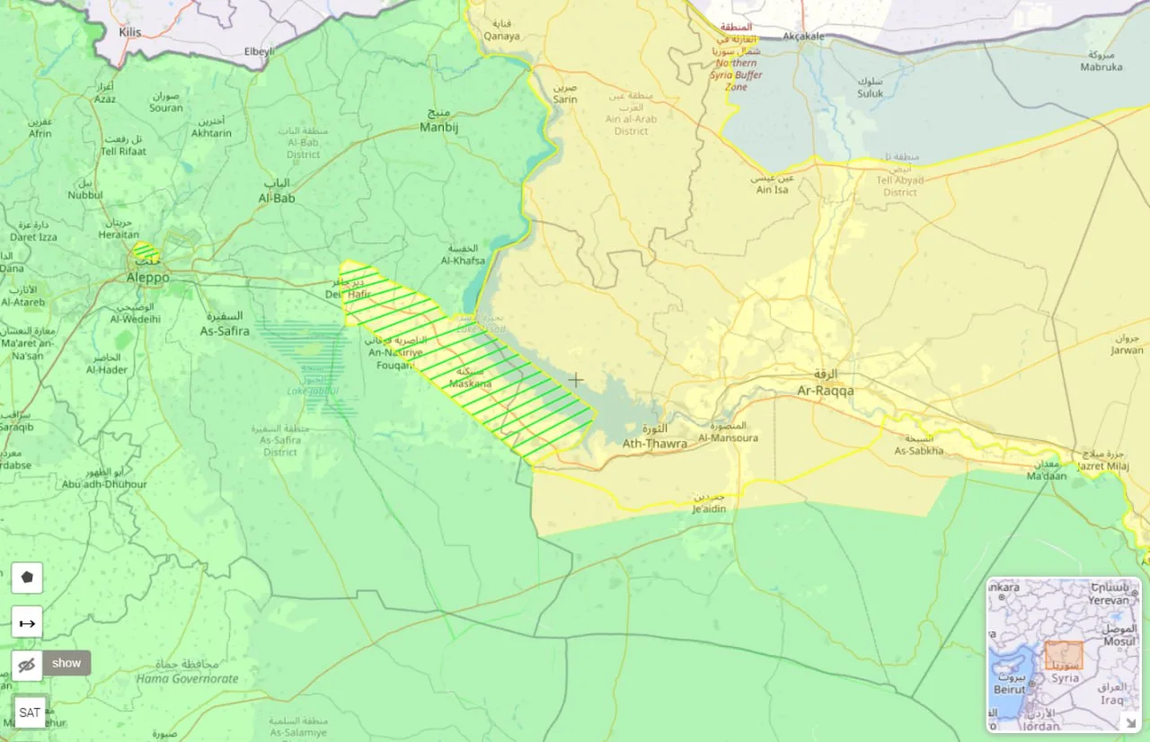 В результате давления боевиков нового сирийского режима и при посредничестве США, курдские формирования оказались вынуждены покинуть занимаемые еще с 2012 года районы провинции Алеппо. Но не успели курды отойти с этих территорий к Евфрату (карта 1), как сирийское руководство признало зоной военной операции заодно и последние населенные пункты к югу от Евфрата, все еще занимаемые СДС, и начали туда наступление (карта 2).