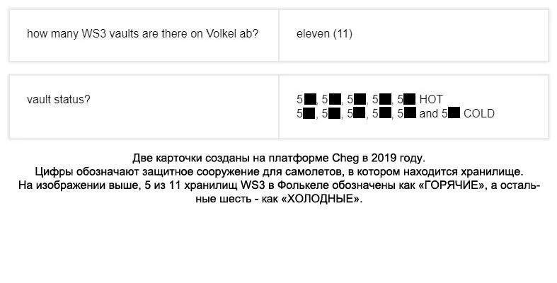 На карточках были указаны конкретные номера ангаров с пометками «HOT» (горячее — оружие внутри) и «COLD» (пустое). Например, на базе Волкель в Нидерландах солдаты записали: «Укрытия № X, Y, Z — ГОРЯЧИЕ. Остальные — холодные».