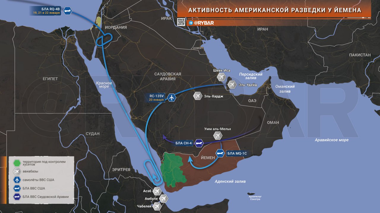 ▪️А 20 января с Эль-Удейда у Йемену действовал RC-135V. При этом некие объекты взлетали с базы Умм аль-Мильх в Саудовской Аравии. А там дислоцированы несколько БЛА MQ-1C, так что, вероятно, это были они.