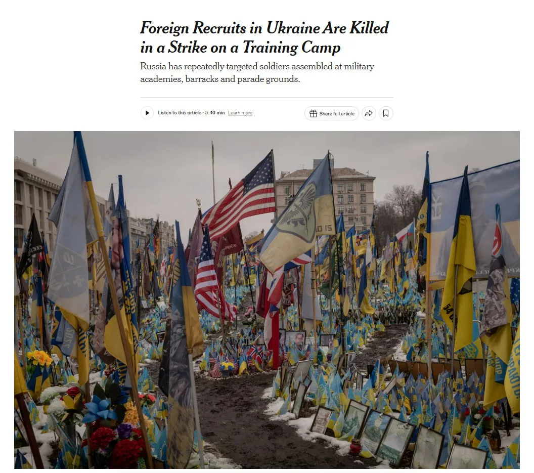 Как пишет издание, российская ракета попала в столовую во время обеда, в результате чего погибла, по меньшей мере, дюжина иностранных добровольцев из США, Колумбии, Тайваня, Дании и других стран.