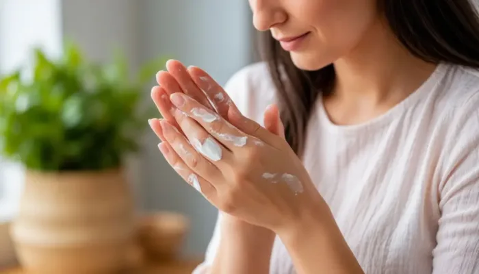 - Масляная ванночка. Погрузите кисти в теплую воду с добавлением 1–2 столовых ложек растительного масла на 10–15 минут. После процедуры промокните руки и нанесите крем.