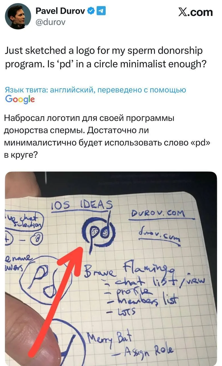 Все началось с того, что ночью основатель Telegram опубликовал логотип своей новой программы донорства спермы. На нем буквы PD, которые отсылают к имени и фамилии бизнесмена.