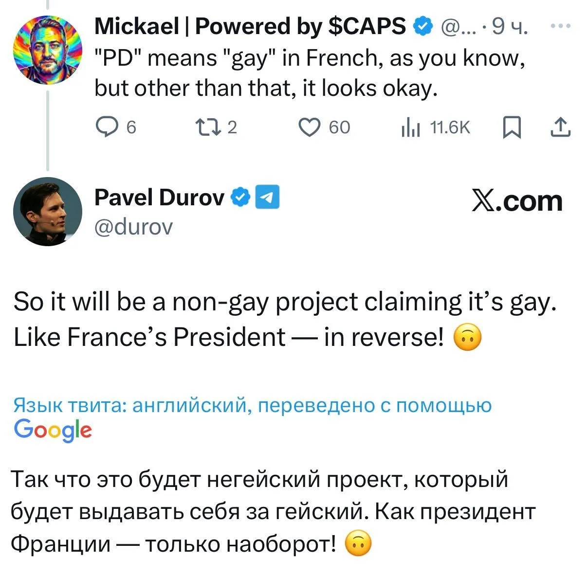 В комментариях Дурову объяснили, что «PD» на французском сленге значит «гей*».