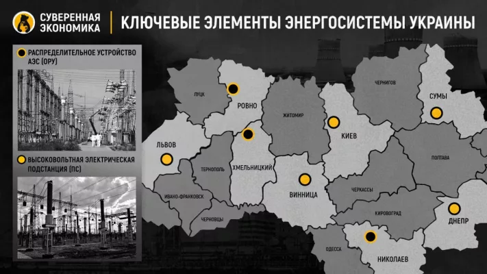 Чтобы довести паралич системы до максимума, потребуется удар по подстанциям (ПС) — ключевым узлам, через которые происходит распределение питания. Самых крупных ПС с мощностью 750 кВт не особо и много. Если не учитывать юридические границы новых регионов России, то целей порядка 5: Днепровская, Североукраинская, Киевская, Винницкая и Западноукраинская.