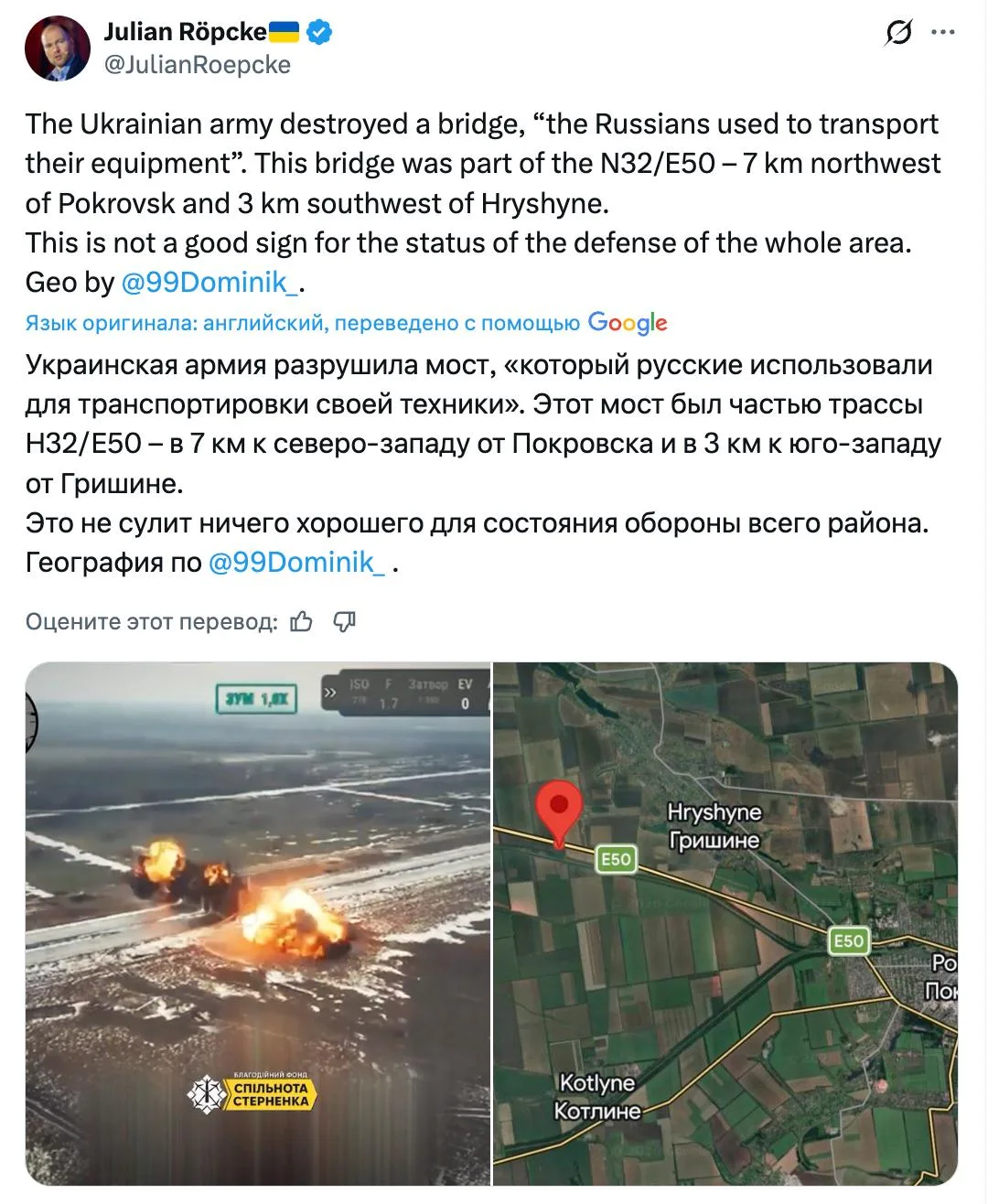 Наш любимый питомец Джихади Джулиан Рёпке снова базует, размазывая версию ВСУ и Сырского о том, что на покровском направлении украинская армия держится и продолжает воевать. Рёпке выкладывает скриншот из видео с якобы подрывом моста западнее Гришино. Этот район ВСУ как считалось ранее удерживали какими-то небольшими силами, а теперь выясняется, что здесь армия РФ организовала логистический канал по переброске резервов. Это значит, что РФ вышла существенно дальше на запад за Покровском, чем считалось ранее.