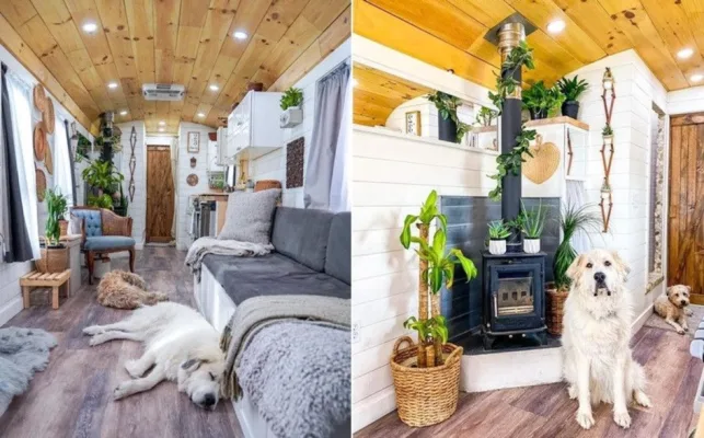 Внутри автобус теперь мало напоминает общественный транспорт. Интерьер, отделанный деревом, создает ощущение уюта и тепла. Ванная и туалет облицованы плиткой, а в гостиной установлен мини-камин, который не только греет, но и добавляет атмосферности. Кухонная зона оборудована всем необходимым: здесь есть мойка, газовая плита и вместительный холодильник. Чтобы посуда и другие предметы не падали во время движения, хозяева используют специальные липучки для фиксации на полках.