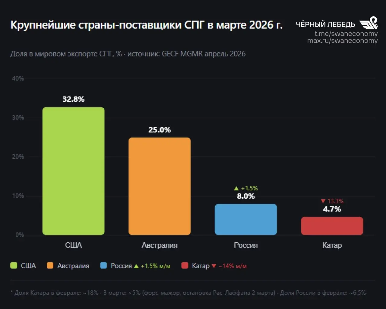 В итоге зависимость ЕС от российского СПГ выросла в марте на 10% м/м. Да так выросла, что Россия теперь подвинула Катар вместе с его падением в первенстве мировых поставщиков СПГ и заняла 3 место.
