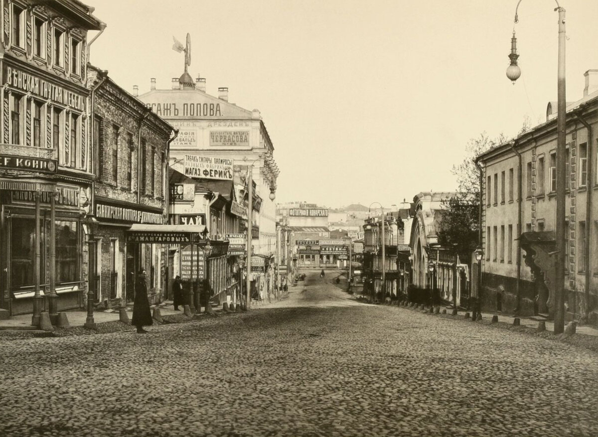 Никольская, 1886 год. Что примечательно: первые этажи зданий, как и сейчас – отданы под магазины и лавки. На этом фото надписи плохо читаются. Найдем другие фотографии. Интересно же, чем промышляли предприниматели 19-го века.