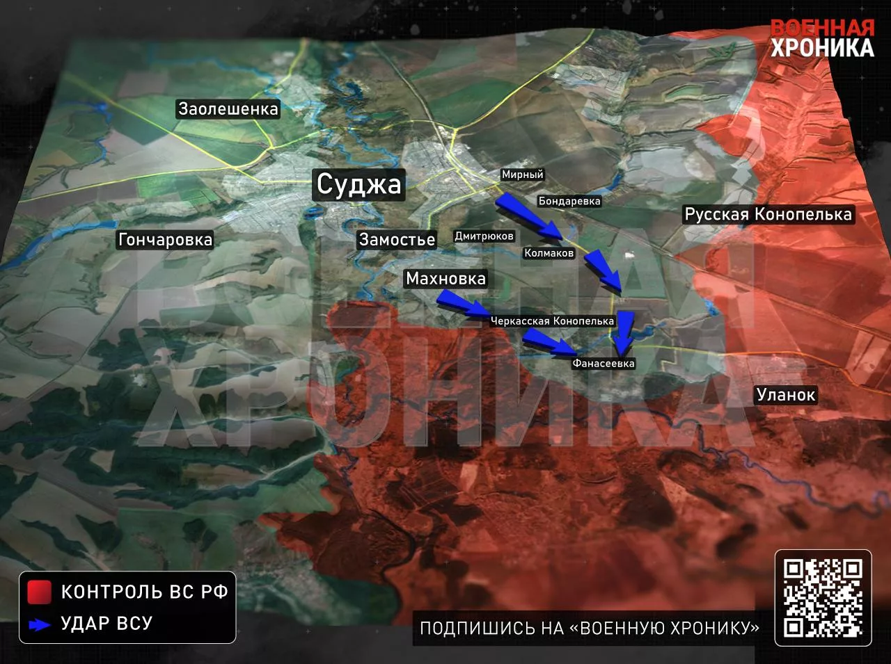 - удары под Суджей наносятся не просто так. Основная цель — как можно сильнее замедлить продвижение ВС РФ к самому городу через Махновку, находящуюся на предельно малой и «психологически сложной» для ВСУ дистанции от города.