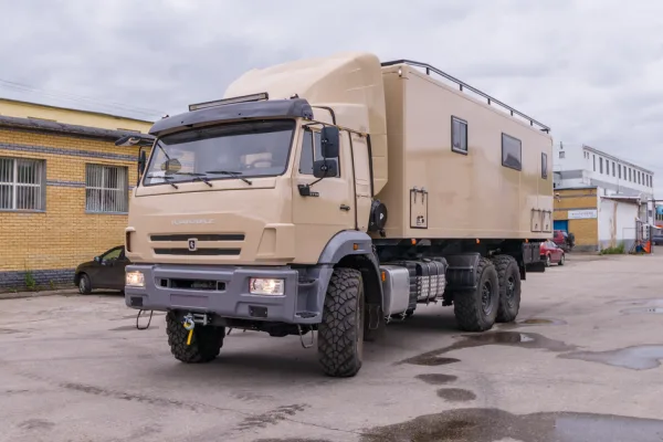 Шасси КАМАЗ 43118 подверглось серьезной доработке. Бежево-серый глянец подчеркивает современный стиль, а спальное место в кабине, кондиционер, вибро- и шумоизоляция, а также автономный отопитель Webasto делают поездки максимально комфортными. Для сложных условий предусмотрены механическая и электрическая лебедки, подогрев топливной системы, защита баков, светодиодная балка и камера заднего вида. Даже аудиосистема здесь не просто для галочки — она создает атмосферу уюта в дороге.