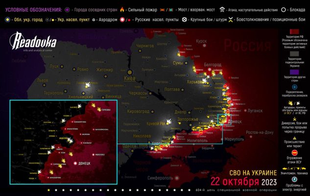 На Авдеевском участке продолжаются бои в районе железной дороги у Бердычей и в районе террикона. ВСУ пытаются прорвать нашу оборону у Песок. В Марьинке продолжаются бои — русская армия выбивает (https://t.me/readovkanews/68215) противника из укрепов на почти стертых с лица земли западных окраинах города.