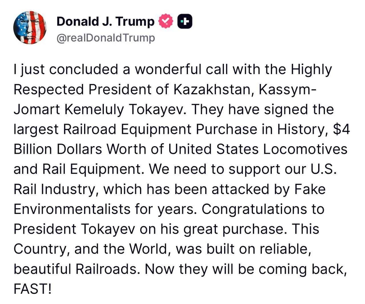 Дональд Трамп очень доволен этой продажей, благодарит президента Токаева и отмечает, что все люди, беспокоящиеся о природе, не должны мешать американской железнодорожной промышленности.