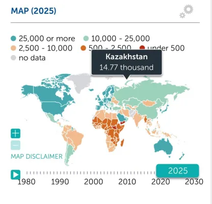 В Казахстане на человека приходится $14,77 тысяч, а в России — $14,26 тысяч. На третьем месте среди стран бывшего СССР Туркменистан — $13,34 тысячи.