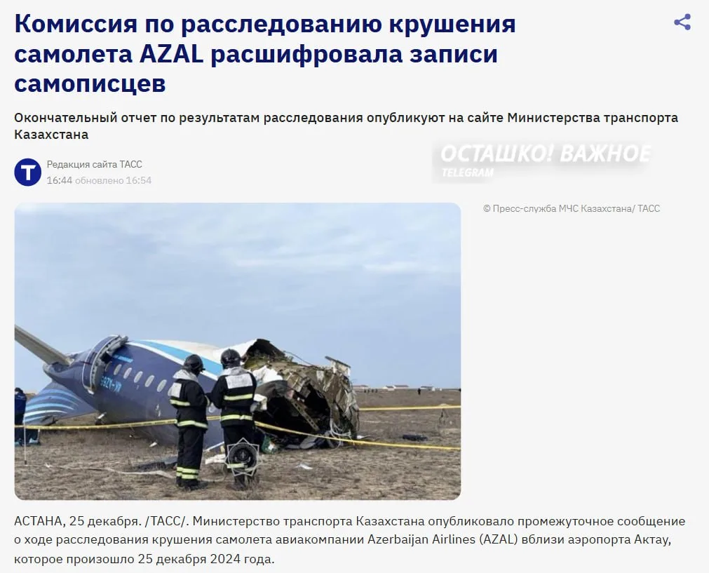 «Две ракеты, которые были выпущены российской системой ПВО, не поразили самолет AZAL напрямую, а взорвались в нескольких метрах, и борт задело не поражающими элементами, а обломками, поэтому пилот воспринял это как столкновение со стаей птиц».