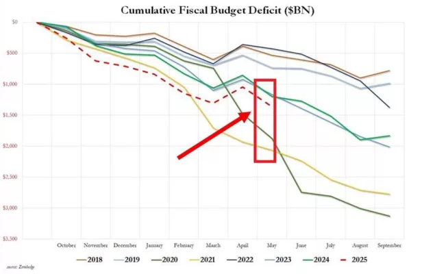 За первые восемь месяцев 2025 финансового года бюджетный дефицит составил 1,37 трлн долл., что является третьим по величине показателем в истории.
