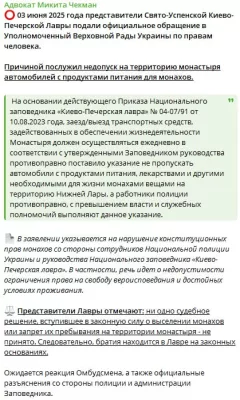 Монахи назвали такие действия незаконными и направили официальное обращение к омбудсмену Верховной Рады Дмитрию Лубенцу. В документе подчеркивается, что в соответствии с распоряжением заповедника от 10 августа 2023 года, транспорт, обеспечивающий жизнедеятельность лавры, должен беспрепятственно проезжать на ее территорию.