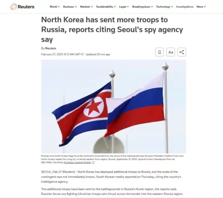 «Северная Корея перебросила дополнительные войска в Россию, но масштабы контингента не были известны сразу», — заявляет агентство Reuters со ссылкой на разведывательное агентство Сеула.