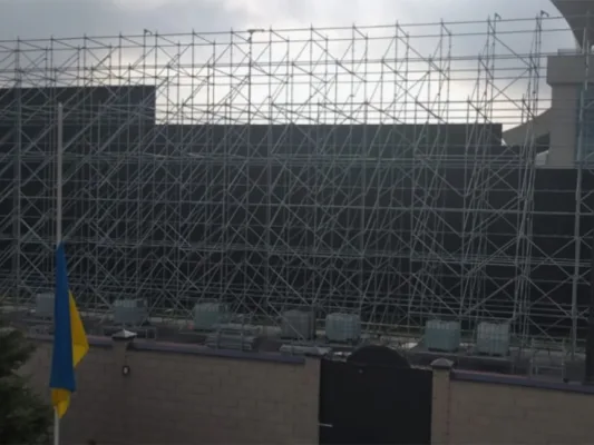 Свидетели отмечают, что экран фактически «перекрыл» выход из калитки посольства, а двухэтажное здание с флагштоком и жёлто-синим флагом оказалось частично «замаскированным».