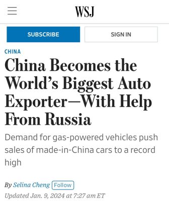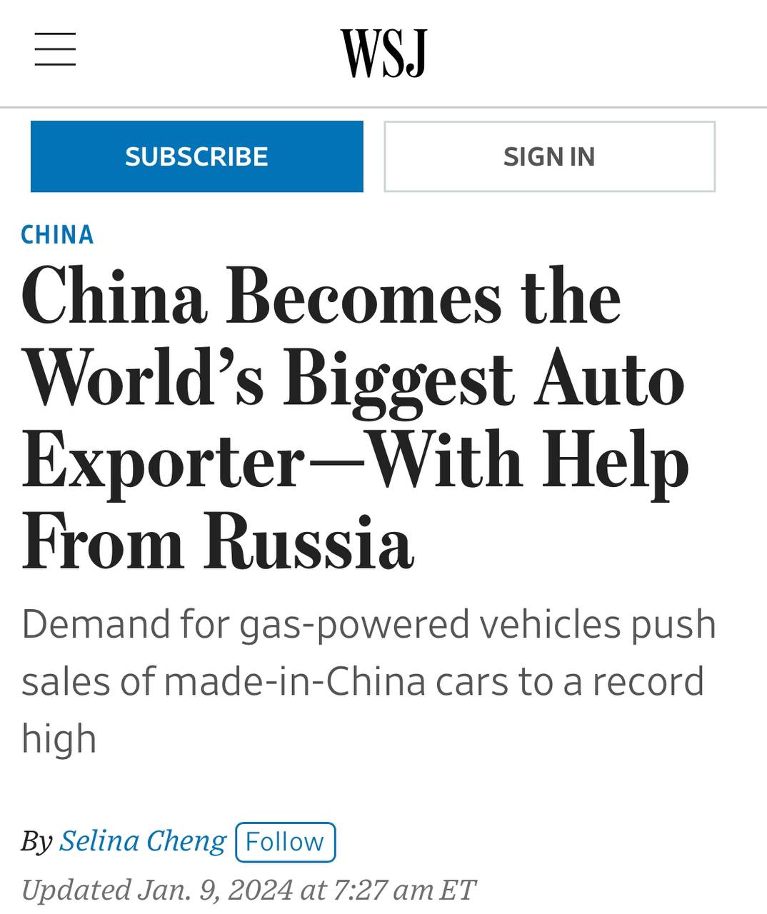 «Продажи китайских автомобилей за рубежом выросли до рекордного уровня в прошлом году, превзойдя Японию как крупнейшего в мире экспортера автомобилей и ознаменовав тектонический сдвиг в мировой индустрии».