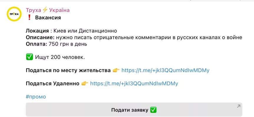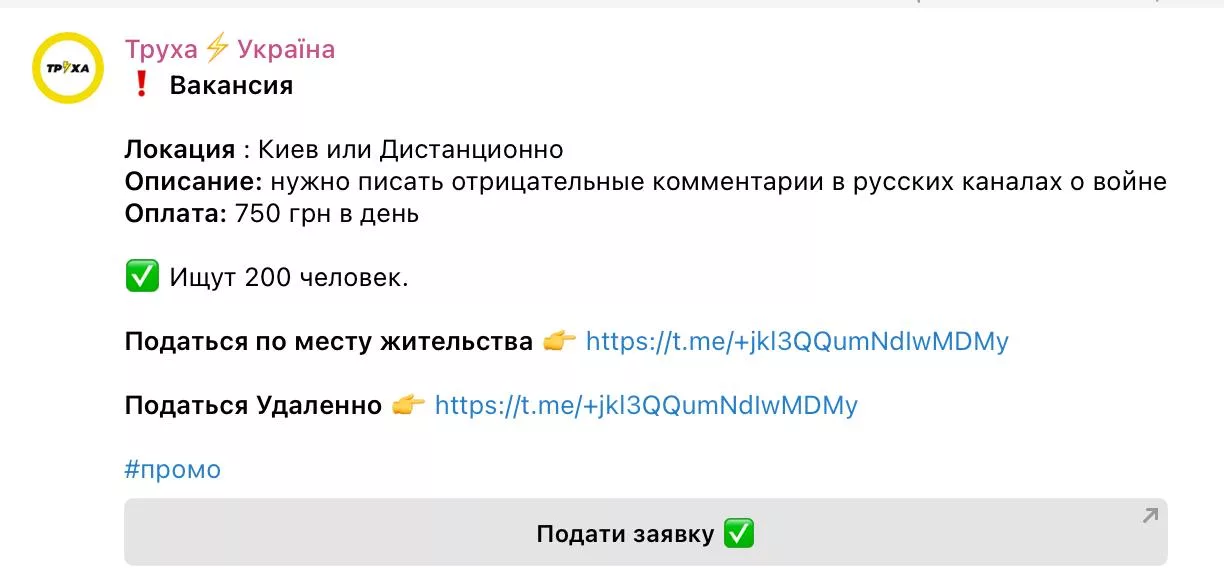 Условия: работа удаленно или из Киева, оплата – 750 гривен в день. Задача – писать гадости в русских каналах, изображать «протест внутри России» и «усталость от войны».
