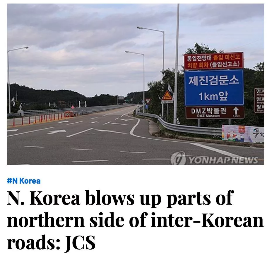 «Северная Корея взорвала участки дорог Кёнги и Тонхэ к северу от военной демаркационной линии около полудня», — цитирует агентство генштаб Южной Кореи.