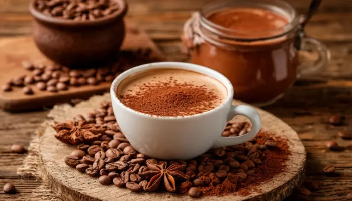 Этот напиток гармонично объединяет насыщенный кофейный аромат с тёплым шоколадным вкусом какао, образуя уютную и сбалансированную композицию.
