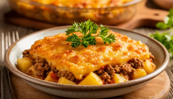 Она сочетает хрустящую картошку, ароматный фарш и нежный сырный соус в одной форме, создавая действительно сытное и комфортное блюдо.