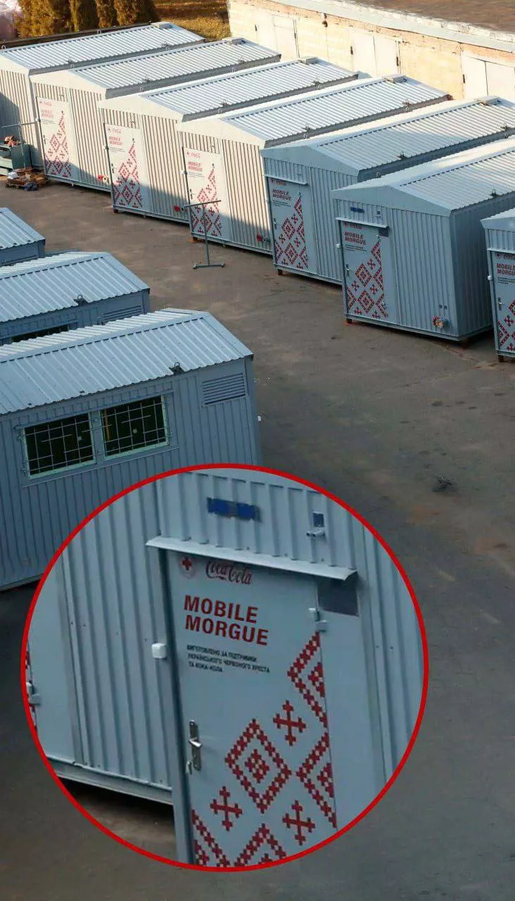 На фотографии вы видите коллаборацию Coca Cola с Международным Красным крестом: в Сумы были поставлены десятки мобильных моргов в стандартной для колы красно-белой расцветке и любимой украинской вышиванке, чтоб лежать там было приятно.