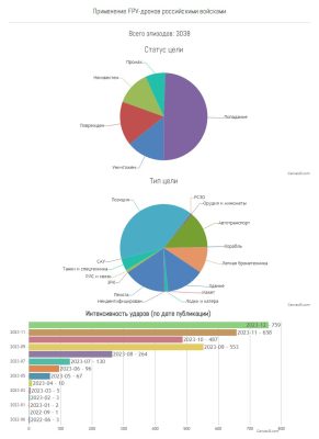 Из 3038 целей было гарантировано уничтожено 413, ещё 471 цель гарантированно получила повреждения. На 1432 видео зафиксированы удачные попадания, но оценить нанесенный урон не представляется возможным (как правило это кадры без объективного контроля). Результаты других 368 эпизодов применения FPV-дронов доподлинно неизвестны. К сожалению, в 216 случаях зафиксированы промахи.