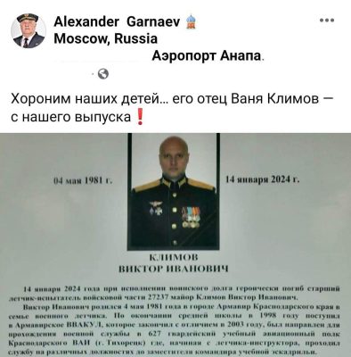 Командир воздушного командного пункта Ил-22, получивший повреждения над Азовским морем, Виктор Климов погиб, сообщил российский летчик-испытатель Александр Гарнаев. Самолёт посадил второй пилот, который также был ранен. Официально информация о гибели Климова не подтверждена.