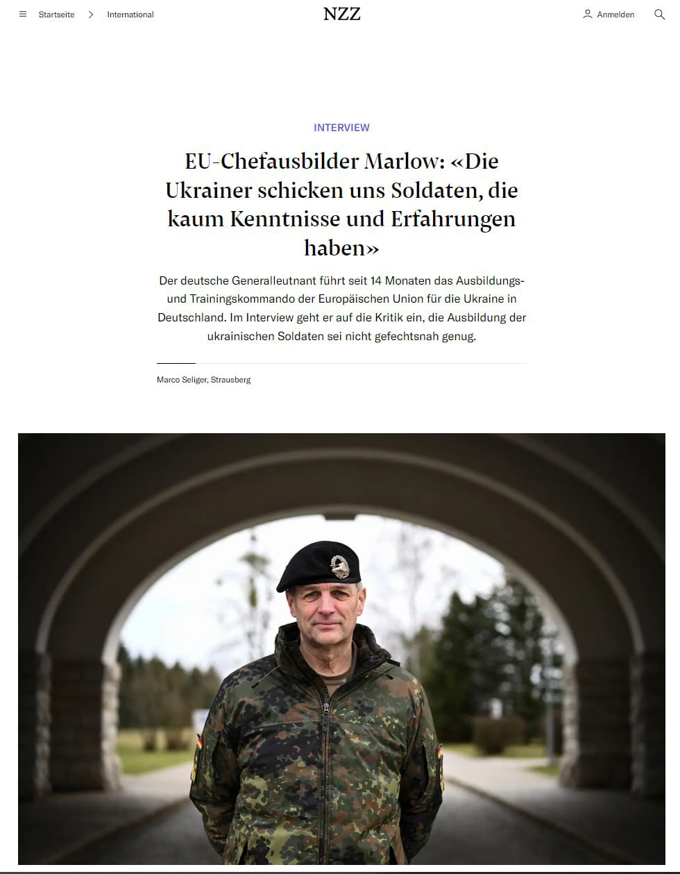 В интервью командующего учебно-тренировочной миссией ВСУ в Германии генерал-лейтенанта Андреаса Марлоу швейцарскому изданию Neue Zürcher Zeitung офицер признался, что результат украинского конфликта решит бесперебойная поставка современного вооружения.