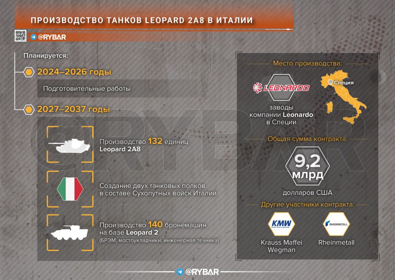 🔻Масштабная программа по перевооружению обойдется в 9,2 млрд долларов и обеспечит заказами как итальянскую ТНК «Леонардо», так и немецких производителей, прежде всего корпорацию «Рейнметалл».
