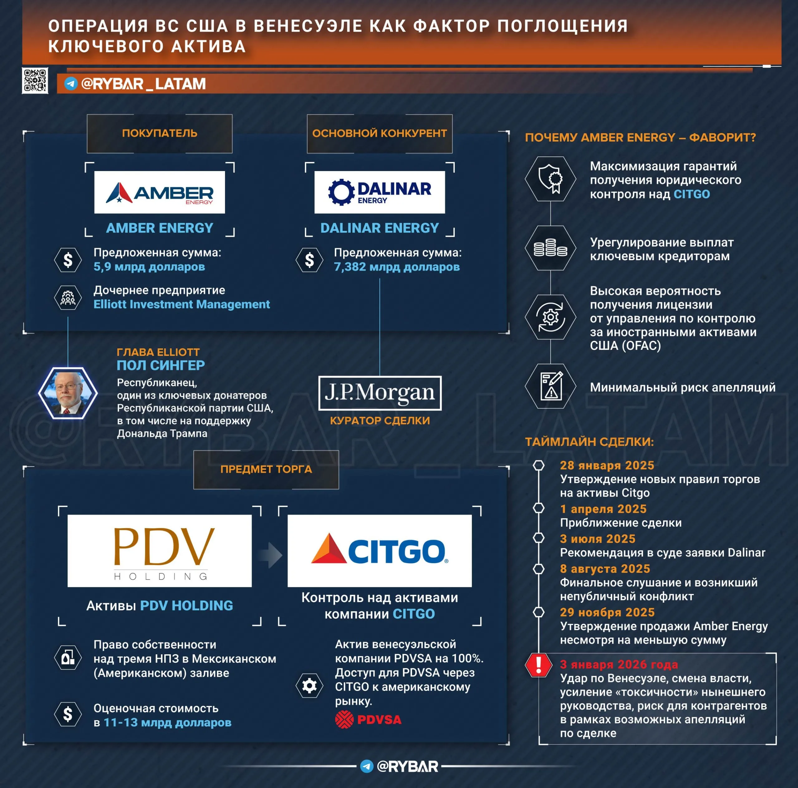 ▪️Но затем уже после активизации команды Трампа на направлении Венесуэлы на сцену вышла Amber Energy (еще одна компания, созданная ради приобретения Citgo инвестиционным фондом Elliott Investment).