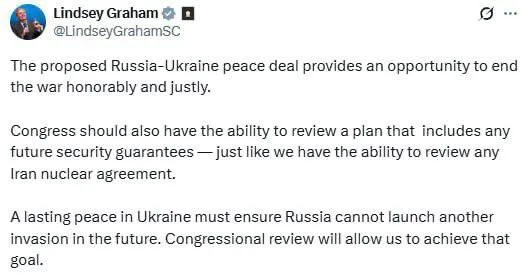 «Крепкий мир на Украине должен гарантировать, что Россия не сможет начать очередное вторжение в будущем. Рассмотрение Конгрессом позволит нам добиться этой цели», считает Грэм