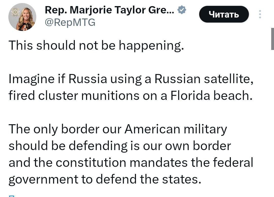 «Этого не должно происходить. Представьте, что Россия, используя российский спутник, выпустила бы кассетные боеприпасы по пляжу во Флориде. Единственная граница, которую должны защищать американские военные, — это наша собственная граница, а Конституция обязывает федеральное правительство защищать Штаты», — написала она в соцсети Х.